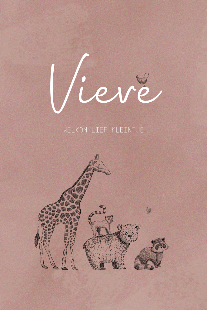 Een trendy babykaartje voor jullie toekomstige dochter. De naam van jullie dochter wordt gedrukt in roségoudfolie. Op het staande geboortekaartje zie je pentekeningen van een giraffe, beer, aapje, wasbeer en vogel. De kaart heeft een hippe structuur achtergrond in oudroze. Bewerk deze kaart naar wens in de online editor.