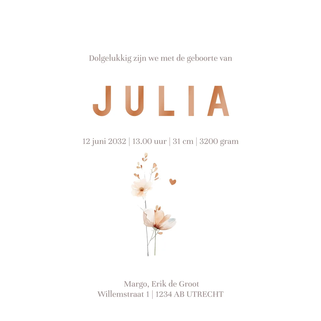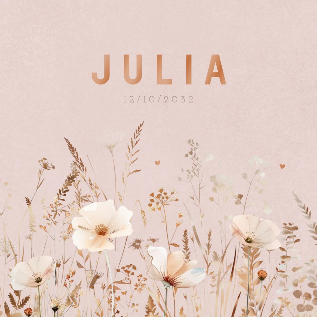 Een romantisch geboortekaartje voor een meisje. Dit kaartje heeft prachtige illustraties van verschillende veldbloemen. Daarboven lees je de naam en geboortedatum. De ronde hoeken en roségoudfolie geven dit kaartje een luxe uitstraling. Het vierkante kaartje is naar wens aan te passen in onze online editor.