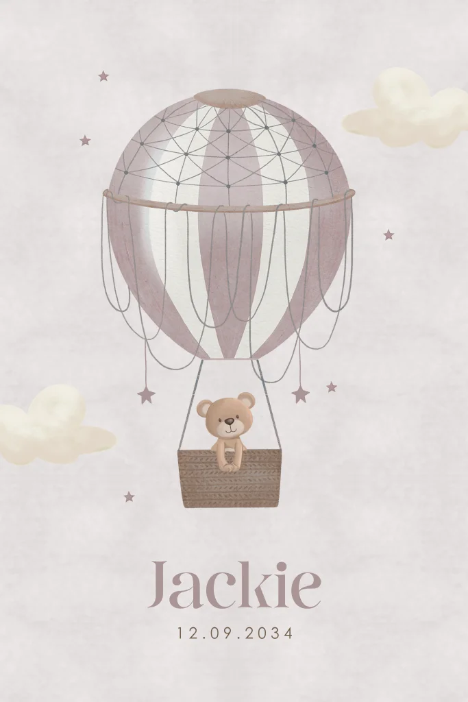 Wat een lief geboortekaartje voor jouw meisje! Het kaartje heeft roze en paarse tinten. In het midden zie je een luchtballon vliegen tussen de wolkjes. In de luchtballon zit een beertje. Pas het ontwerp naar wens aan in onze online editor.