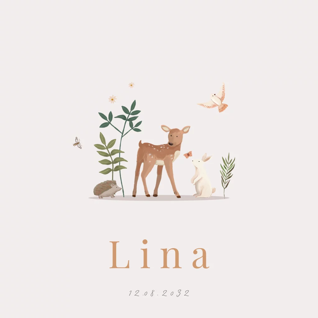 Wat een lief geboortekaartje voor een meisje. Het rondhoek geboortekaartje heeft schattige illustratie van verschillende bosdieren. Je ziet een hertje, konijntje, vogeltje en een egeltje. Het ontwerp is naar wens aan te passen in onze online editor.