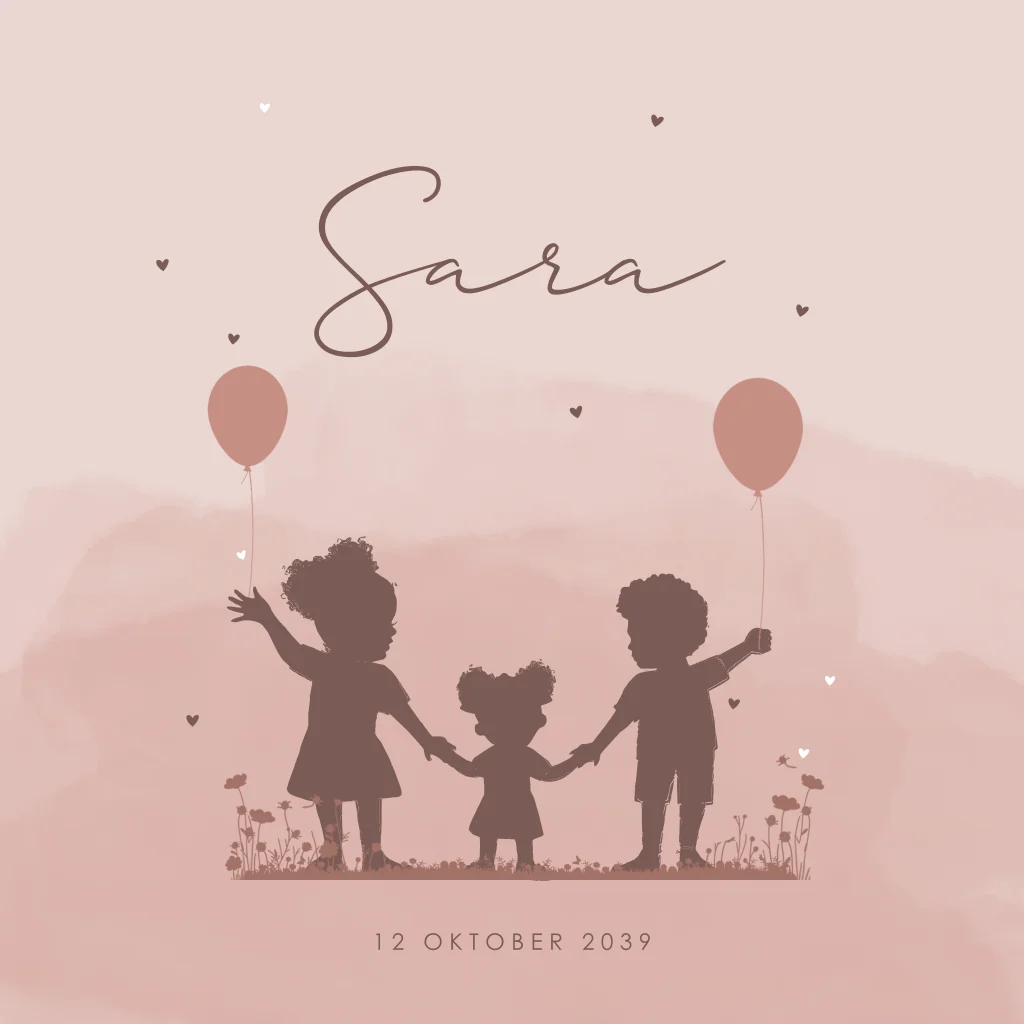 Een derde kindje! Met dit lieve kaartje kan je jullie gezin leuk weegeven doormiddel van silhouetjes. Het kaartje heeft een roze watercolour achtergrond. Op de voorgrond zie je de silhouetjes van jullie eerste twee kindjes, een grote zus en broer voor jullie derde kindje. De kindjes hebben een ballon vast. Pas het kaartje naar wens aan in onze online editor.