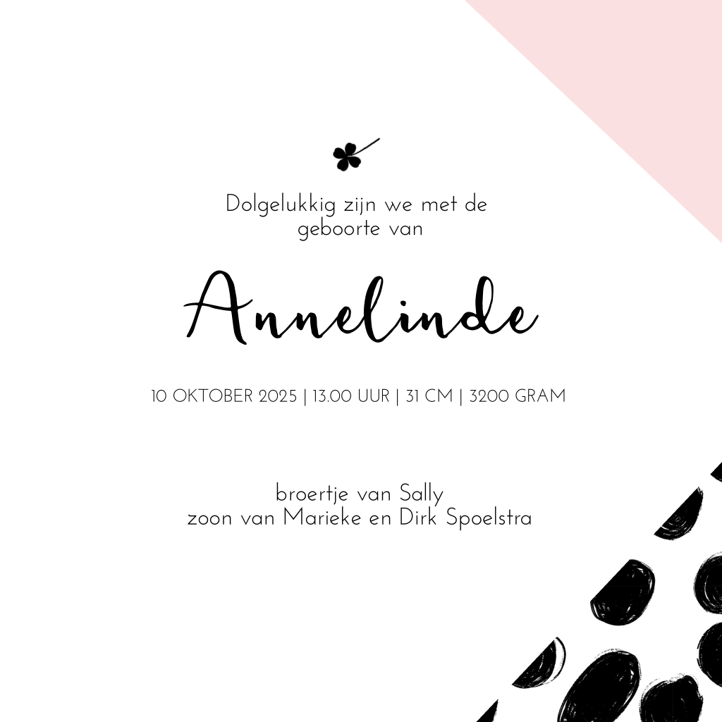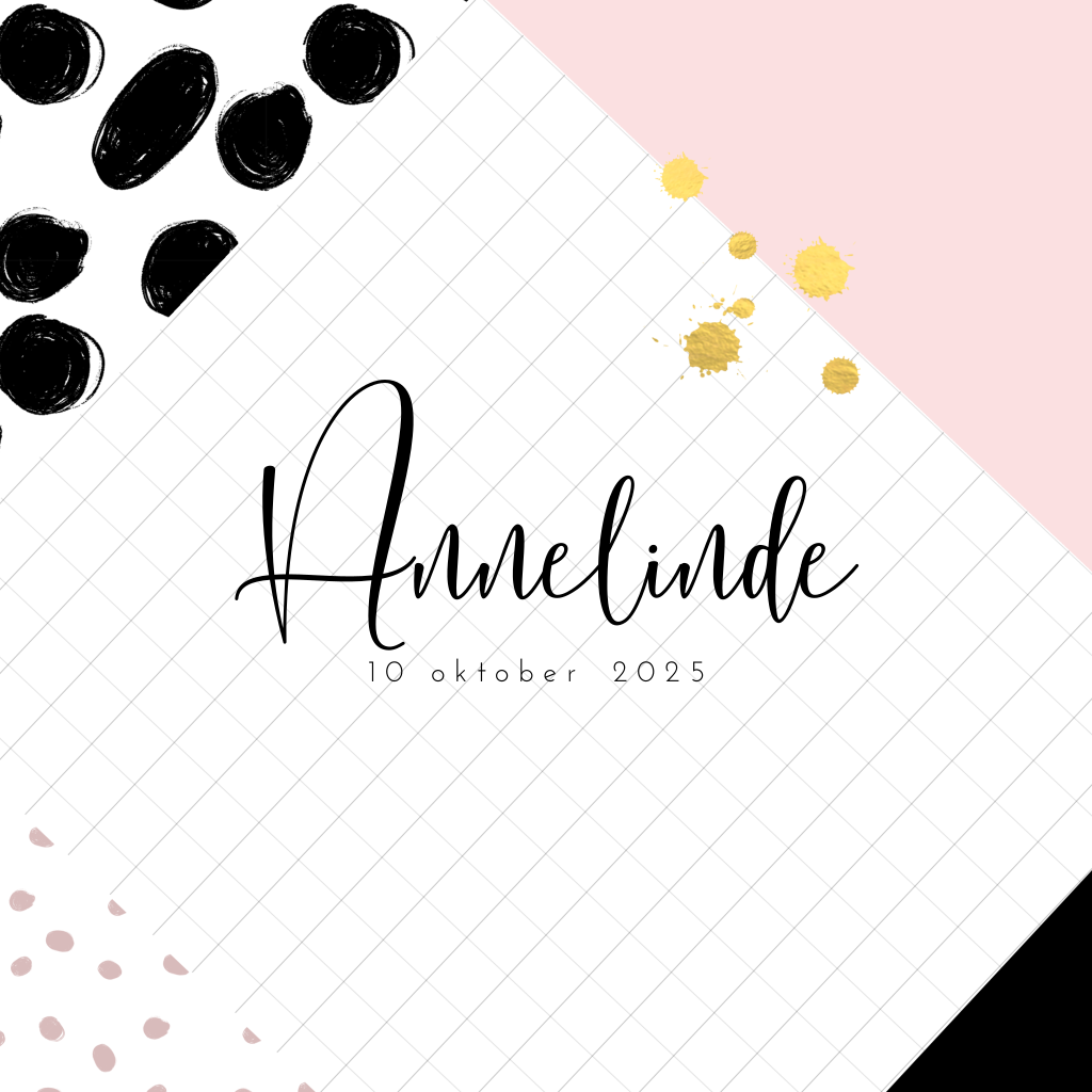 Een ruitjespatroon, stippenpatronen en diverse geometrische vlakken; wat een prachtige, moderne geboortekaart voor een meisje! In de kleuren roze, zwart en wit. De verfspetters in goudlook maken hem helemaal af!