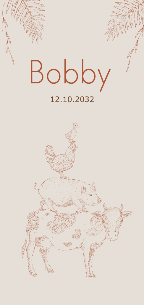 Een neutraal geboortekaartje voor jullie kleintje. Het kaartje heeft schattige pentekeningen van boerderijdieren die op elkaar zijn gestapeld. Het geboortekaartje is in onze online editor te personaliseren. Bestel een proefdruk om het kaartje in het echt te bewonderen.