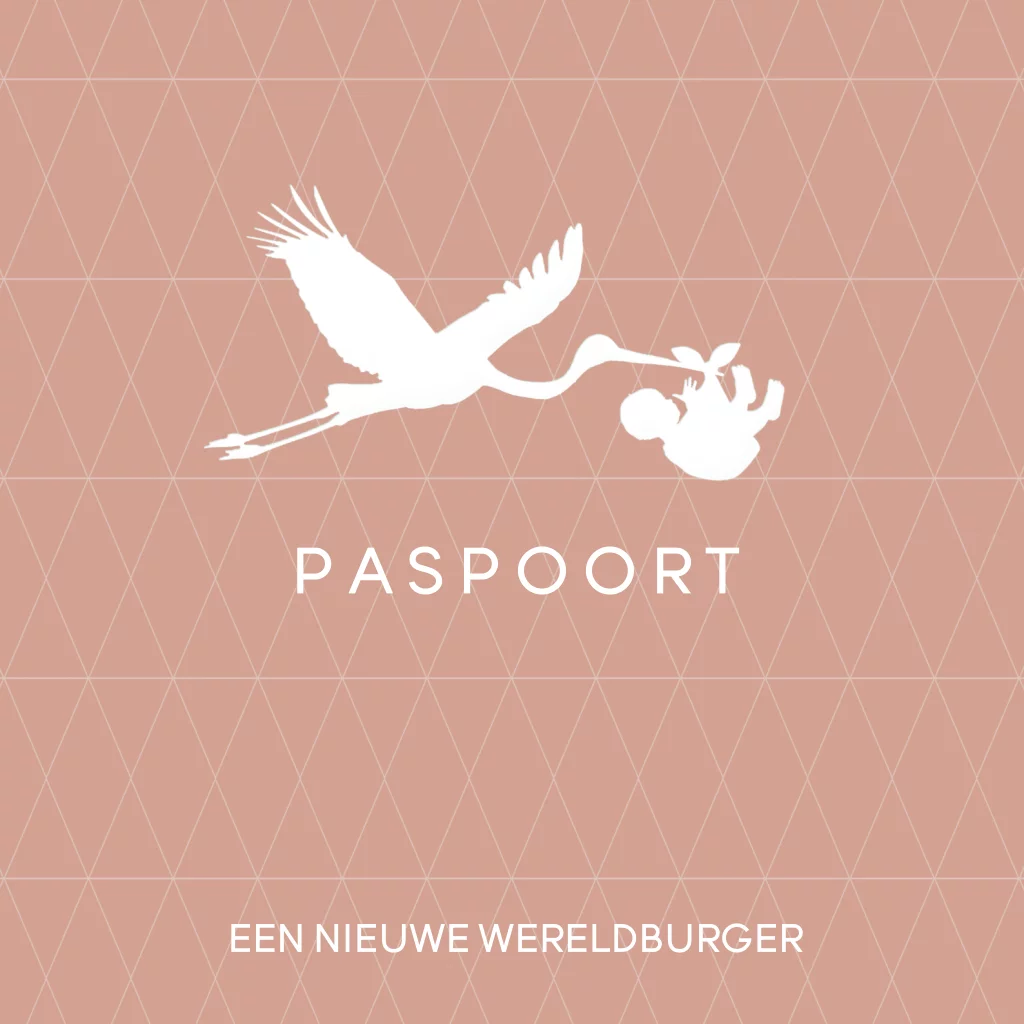 Mooi hip geboortekaartje in paspoort vorm voor een meisje met ooievaar en geheel aanpasbare teksten.