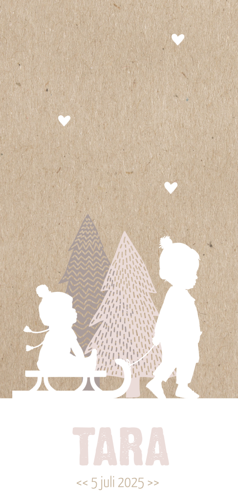 Een jongen die zijn kleine zusje op de slee trekt, wat lief! Dit hippe geboortekaartje met silhouetten heeft een trendy achtergrond van kraftkarton en is versierd met hartjes, kerstbomen en een illustratie. Teksten, lettertypes en kleuren kun je naar wens aanpassen in de online editor!