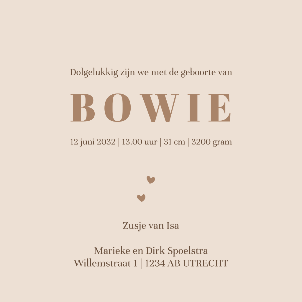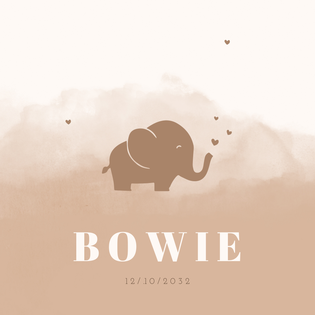 Een geboortekaartje met natuurlijke aardetinten. Dit watercolour geboortekaartje heeft een aardetint watercolour achtergrond. In het midden van het kaartje zie je een olifantje omringd door hartjes. Het kaartje krijgt een extra zachte uitstraling door de ronde hoeken.