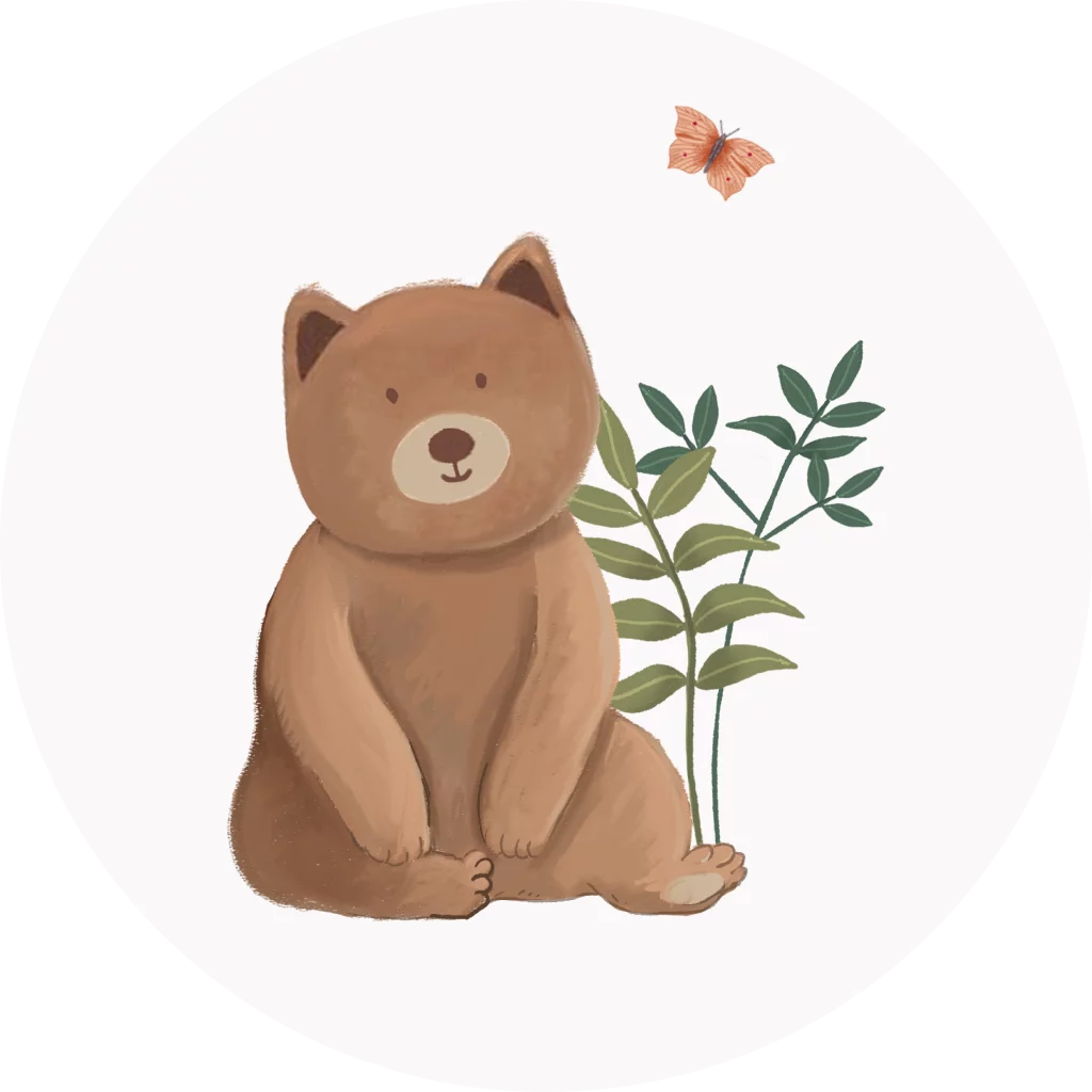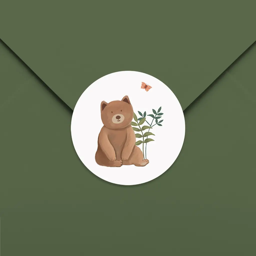 Het versturen van de geboortekaartjes wordt een feestje met deze sluitsticker. Op de sticker zie je een zittend beertje met takjes en een vlinder. De sticker kan naar wens aangepast worden in onze online editor.