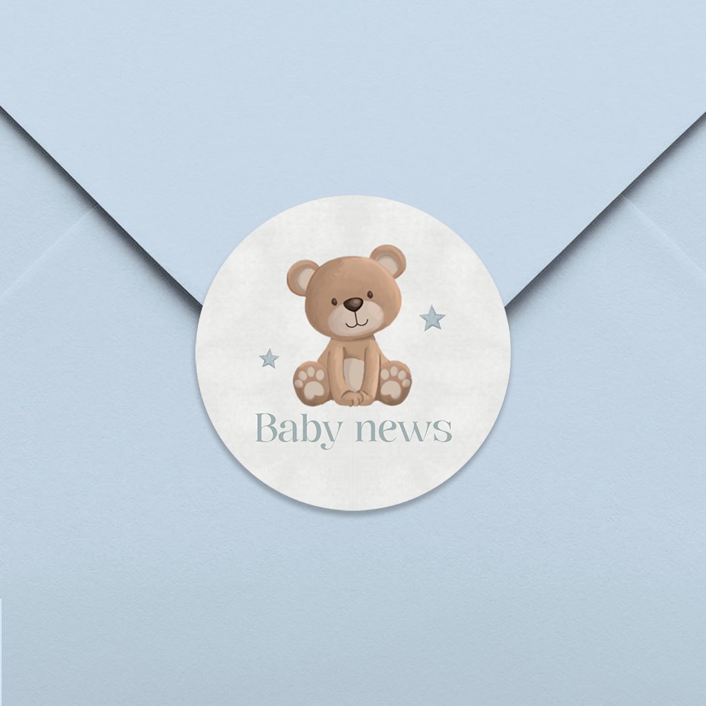 Blauwe sluitsticker met teddybeertje en baby news - per 25 stuks