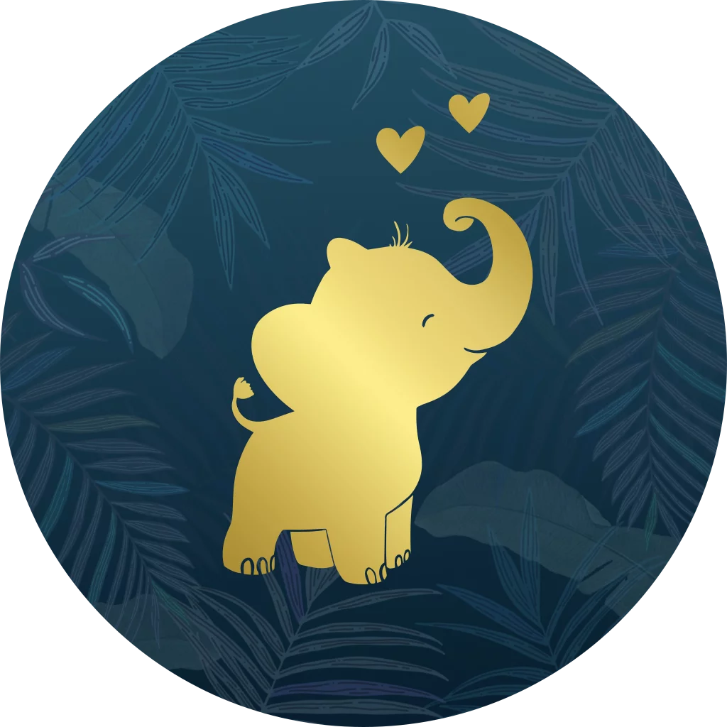 Grappige bijpassende sluitsticker voor de envelopjes van het geboortekaartje! Op de blauwe achtergrond met junglepatroon staat een vrolijk olifantje in goudfolie met twee lieve hartjes erboven.