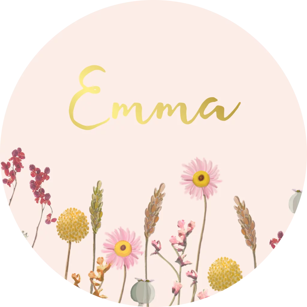 Prachtige bijpassende sluitzegel voor de envelopjes van het geboortekaartje met bloemen! Op de zachtroze sluitsticker staat een rand van vrolijke veldbloemen, de tekst erboven is in goudfoliedruk.