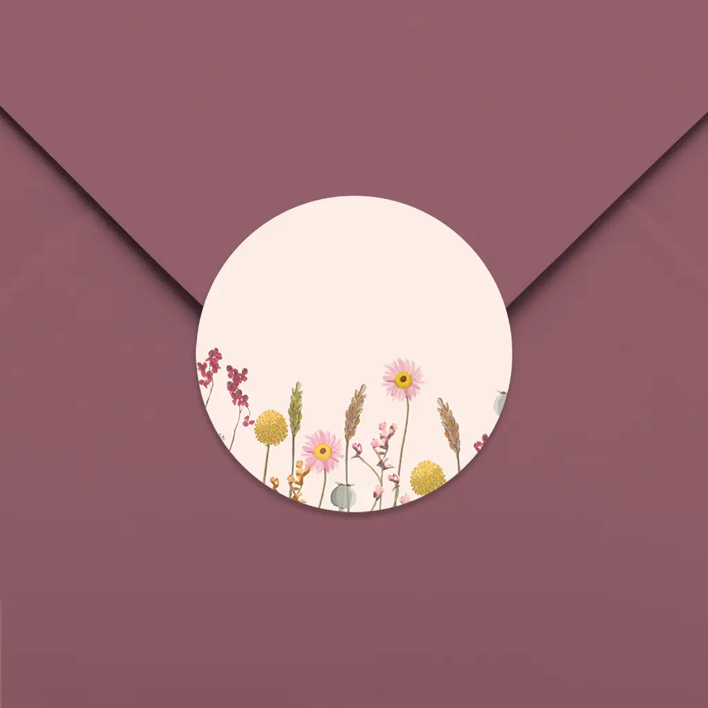 Prachtige bijpassende sluitzegel voor de envelopjes van het geboortekaartje met bloemen! Op de zachtroze sluitsticker staat een rand van vrolijke veldbloemen.