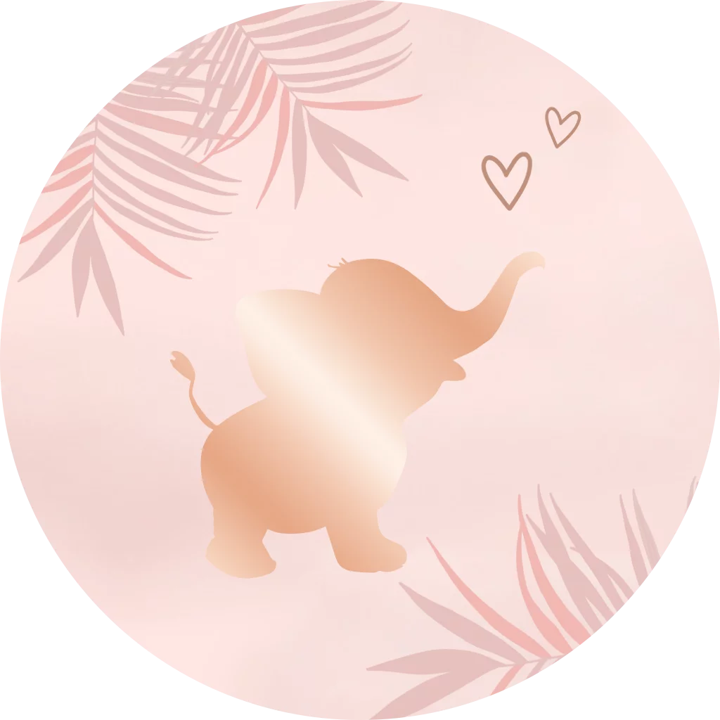 Lieve bijpassende sluitzegels voor het envelopje, op een zachtroze achtergrond met palmbladeren zie je het silhouet van een olifantje in roségoudfolie.