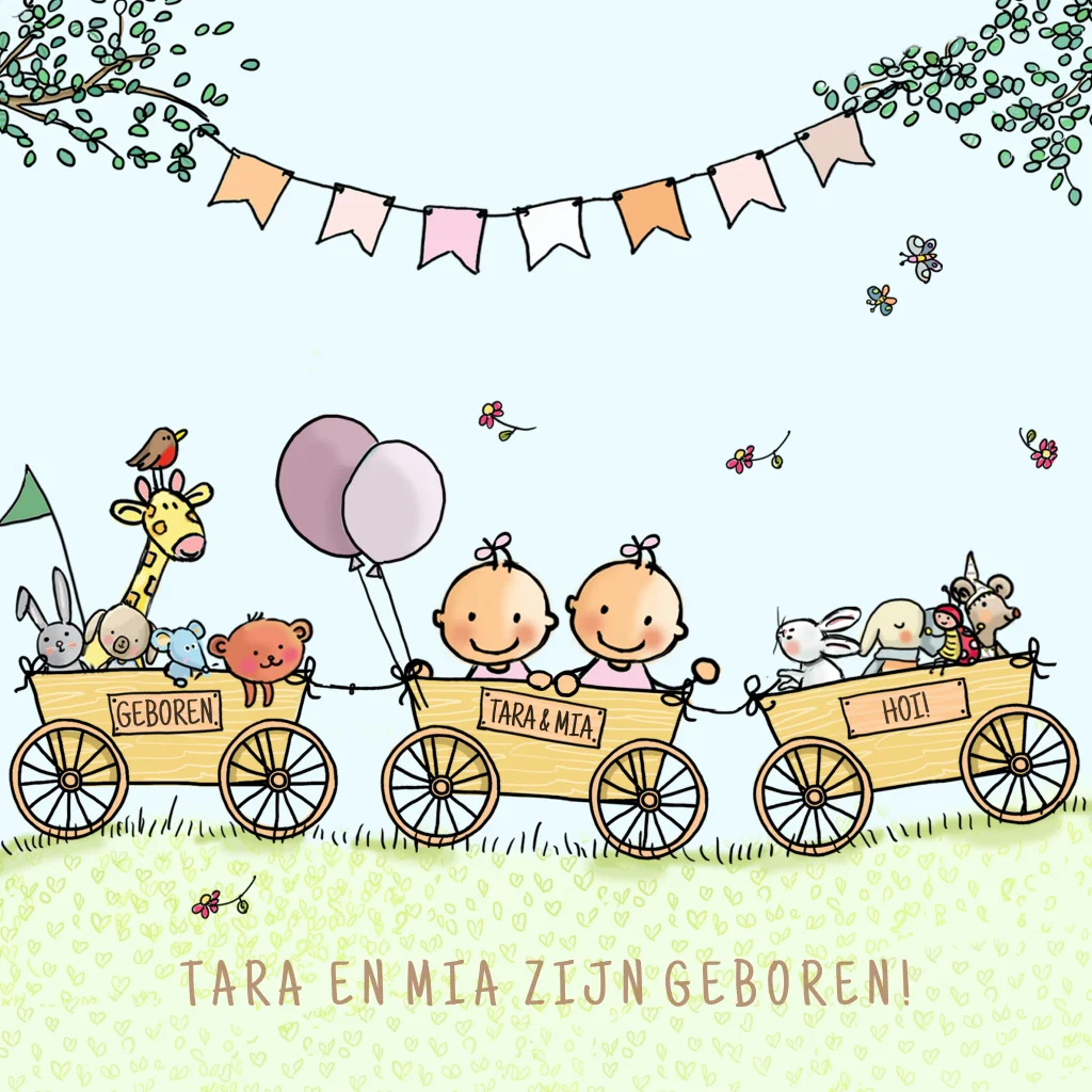 Vrolijk geboortekaartje tweeling meisjes met dieren