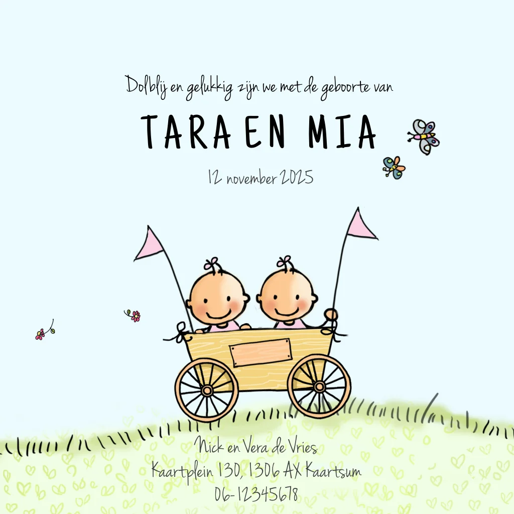 Bijzonder lief getekend geboortekaartje van tweeling zusjes in kar, knuffels, vogeltjes en vlaggen. Dit kleurrijke tweelingkaartje is extra leuk met een gekleurde envelop. Wat dacht je van een lichtroze envelop?