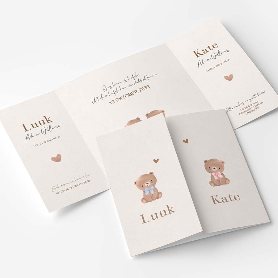 Hoe mooi: dit theatervouw geboortekaartje ontvouwt zich als een klein kunstwerk. Het kaartje heeft neutrale kleuren met daarop de illustratie van lieve tweelingbeertjes. Bewerk het ontwerp naar wens in de online editor.