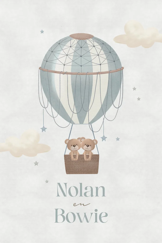 Het kaartje heeft blauwe tinten. In het midden zie je een luchtballon vliegen tussen de wolkjes. In de luchtballon zitten twee beertjes. De sterretjes maken het extra lief. Pas het ontwerp naar wens aan in onze online editor.Dit product maakt onderdeel uit van deze set.