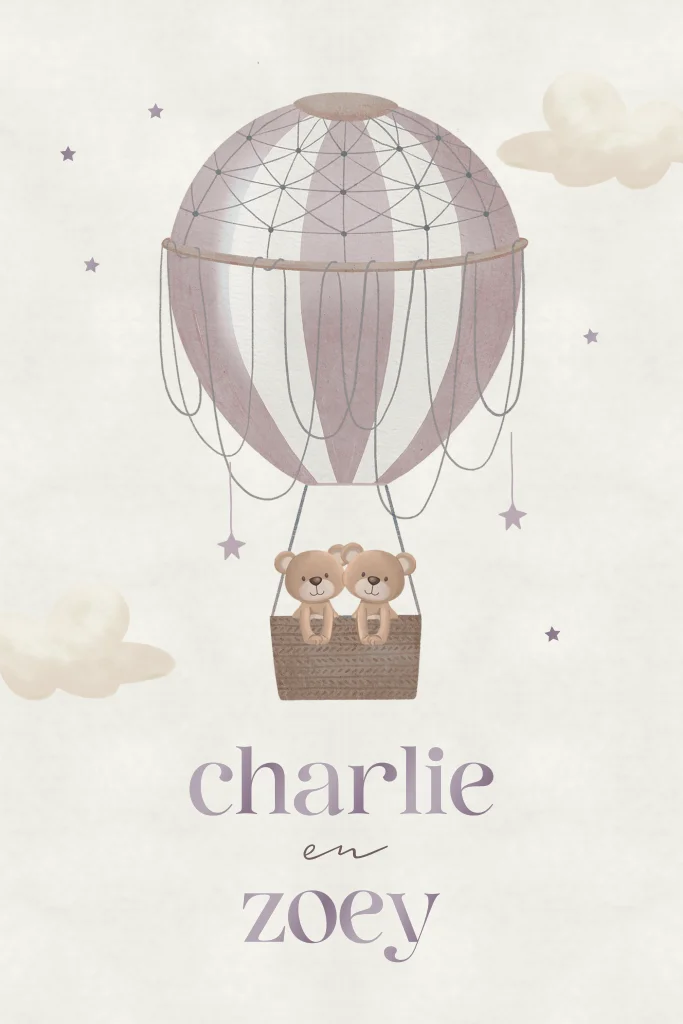 Het kaartje heeft beige tinten. In het midden zie je een luchtballon vliegen tussen de wolkjes. Het kaartje heeft details in hoogglans. In de luchtballon zitten twee beertjes. Pas het ontwerp naar wens aan in onze online editor.