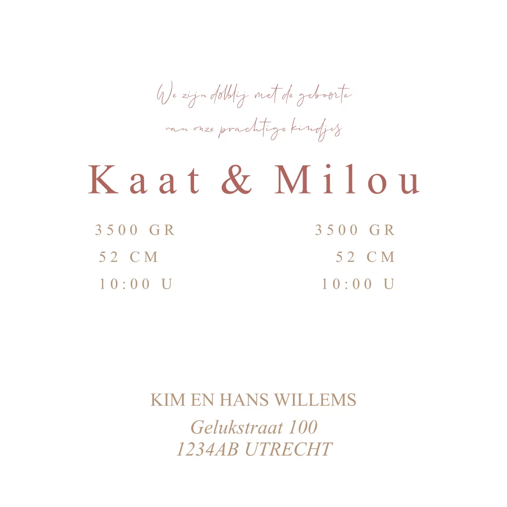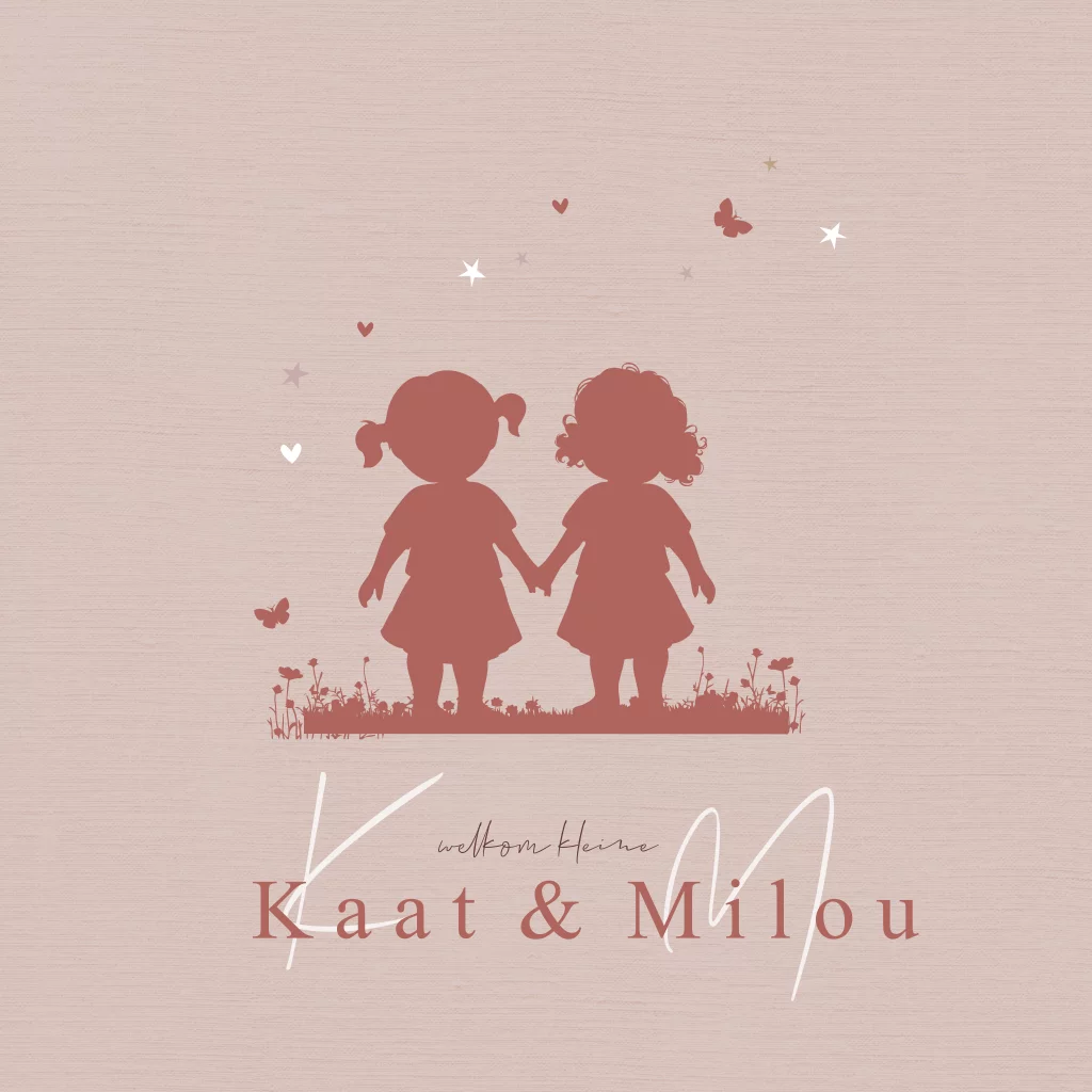 Een lief geboortekaartje voor jullie twee meisjes. Het kaartje heeft mooie roze tinten en in het midden staan de silhouetjes van twee meisjes die onder de sterren lopen. Pas eenvoudig kleuren en tekst aan in de online editor.