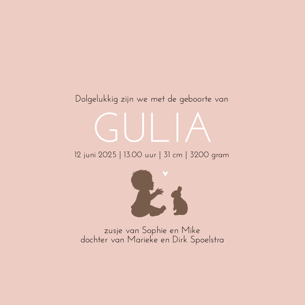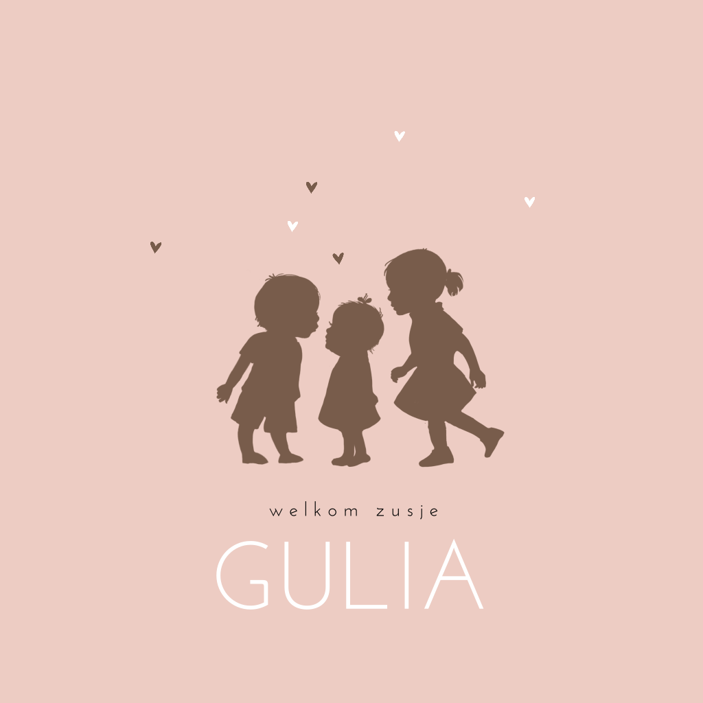 Schattige geboortekaart voor je derde kindje met een lief silhouet van een baby zusje met haar grote broer en zus. De lieve hartjes op de roze achtergrond maken het geboortekaartje helemaal af!
