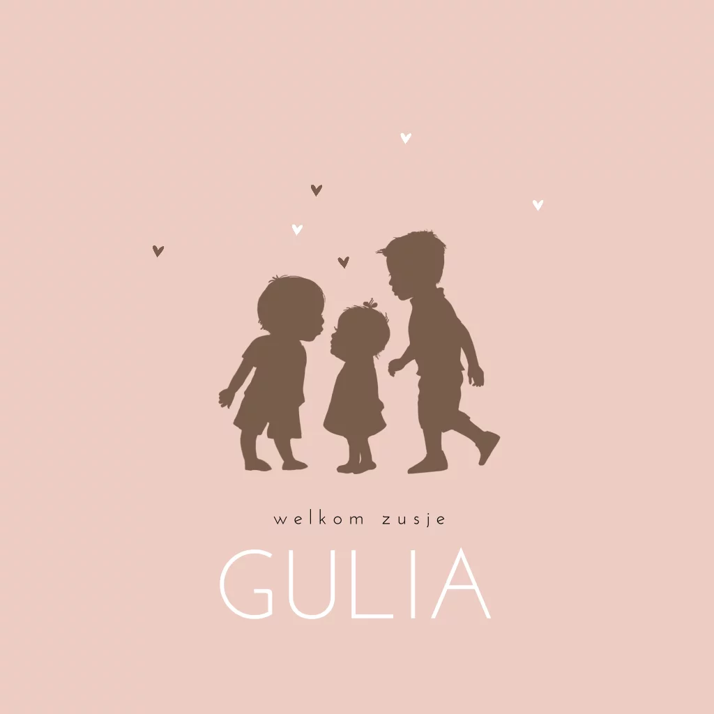 Lief geboortekaartje met silhouet van klein zusje met grote broers