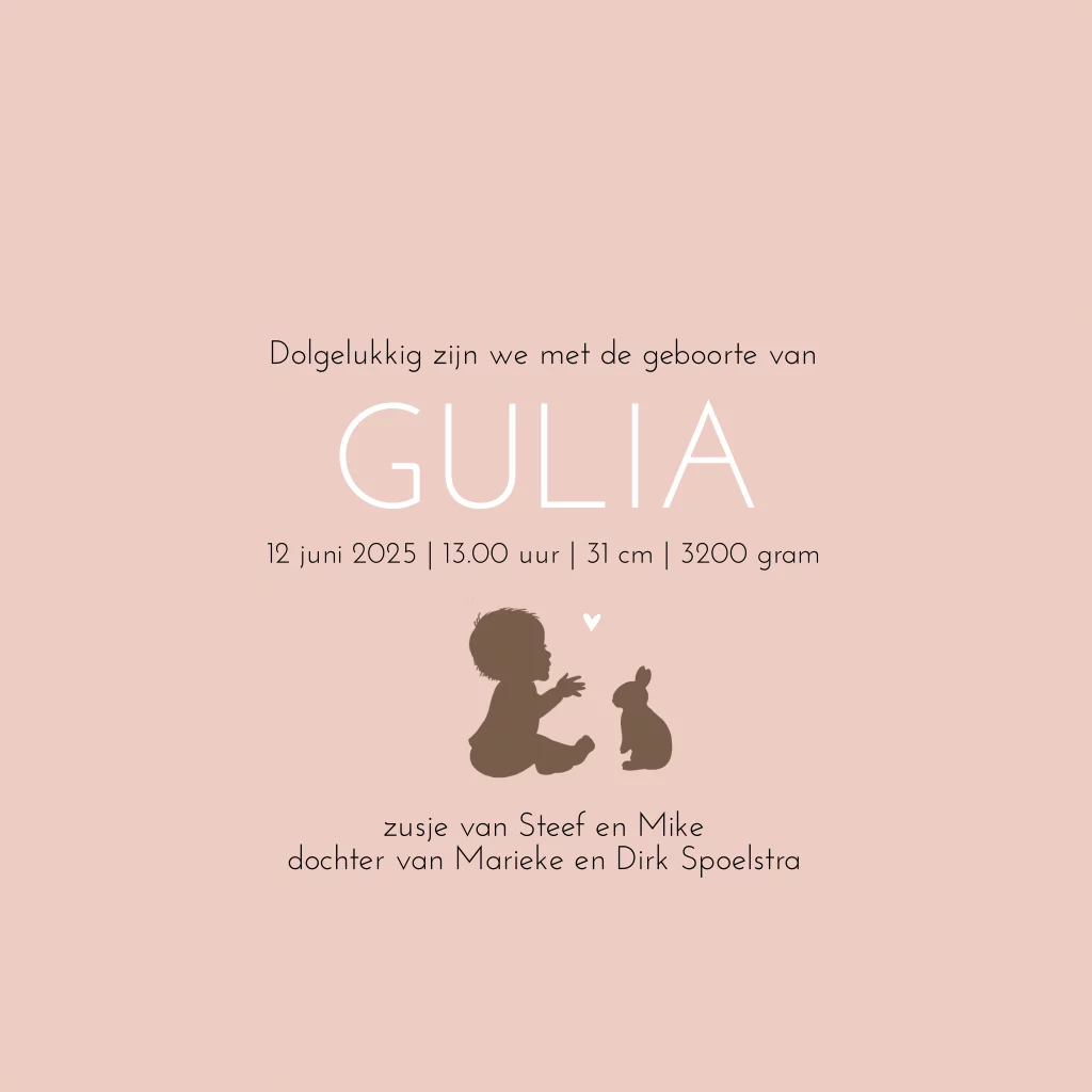 Schattige geboortekaart voor je dochtertje met een hip silhouet van een baby zusje die een kusje van haar twee grote broers krijgt. De hartjes en de roze achtergrond maken het kaartje echt lief!