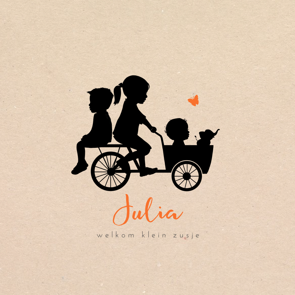 Kraftlook geboortekaart met silhouet van bakfiets zus, broer en zusje
