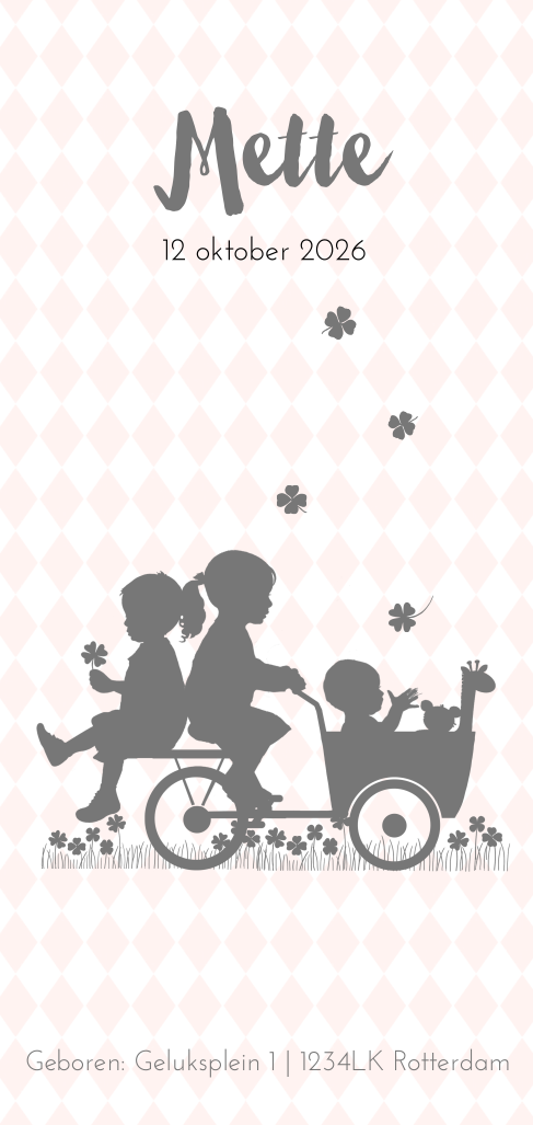 Lief geboortekaartje voor een derde kindje met zusje in bakfiets met giraf en beer knuffel. De silhouetten steken stoer af op de chevron achtergrond.