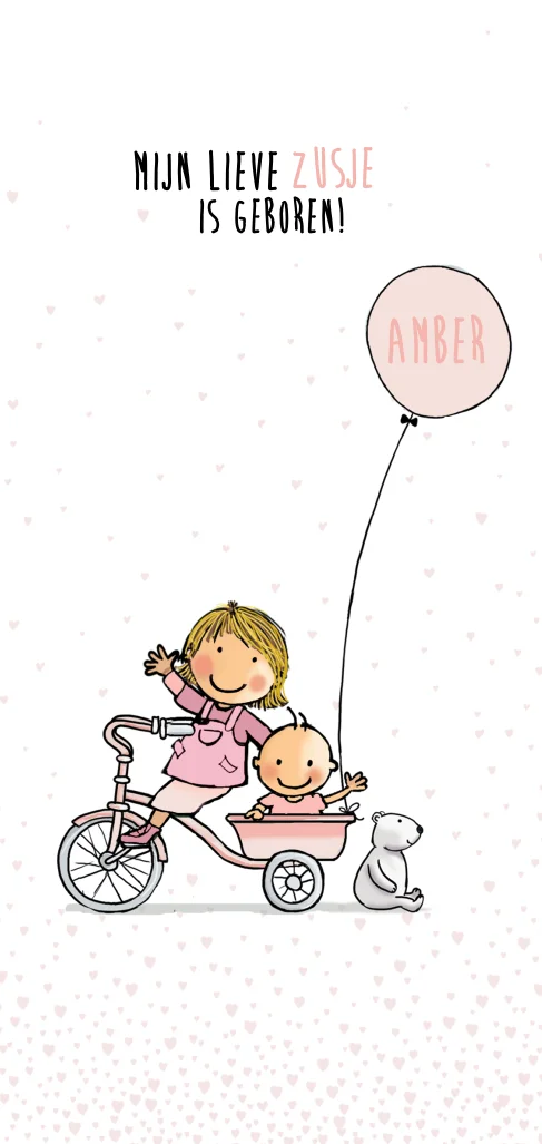 Super lief geboortekaartje van zus met baby zusje in fietsbakje met ballon, lieve ijsbeer en hartjesregen.