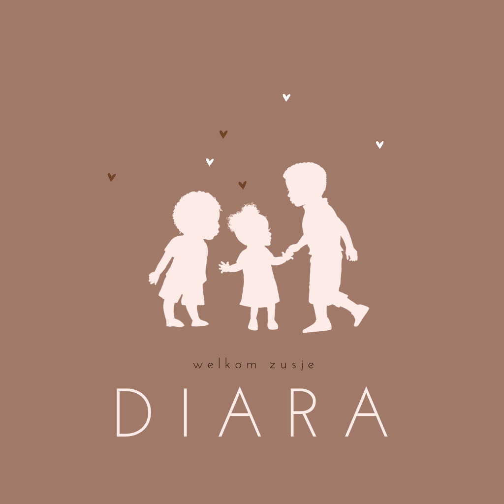 Schattig geboortekaartje voor je derde kindje met een hip silhouet van broertjes. Het jongste baby zusje staat in het midden en krijgt van zijn grote broertjes een kusje. De hartjes op de achtergrond maken dit lieve kaartje helemaal af!