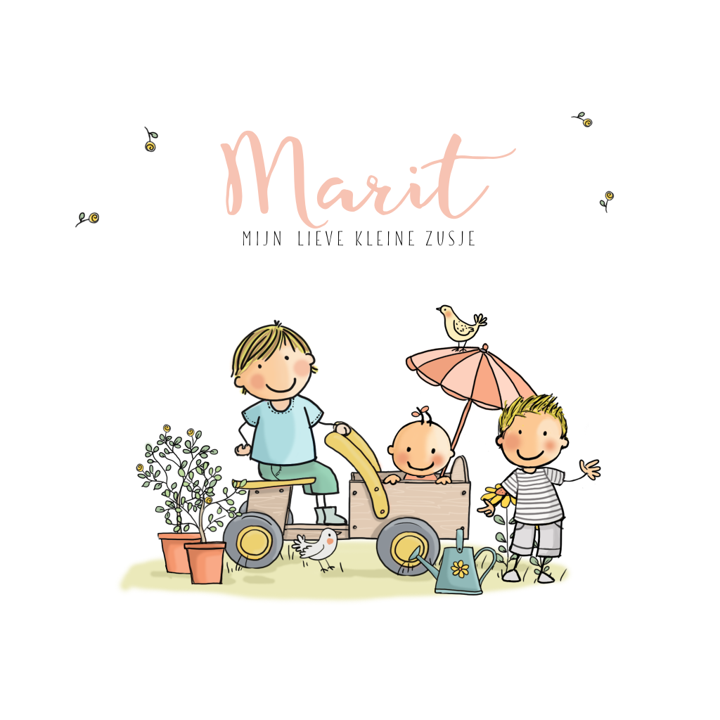 Schattige geboortekaart met kleurrijke tekening van twee broertjes die met hun kleine baby zusje aan het buiten spelen zijn met een houten kar. Met alle bloemetjes, vlindertjes en vogeltjes is dit echt een zomer geboortekaartje!