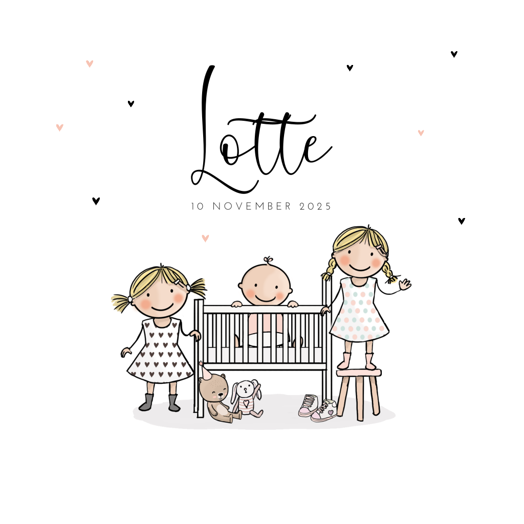 Schattig geboortekaartje met lieve illustratie van twee zussen naast een ledikant waar hun kleine zusje in zit. De hartjes maken dit kaartje echt lief!