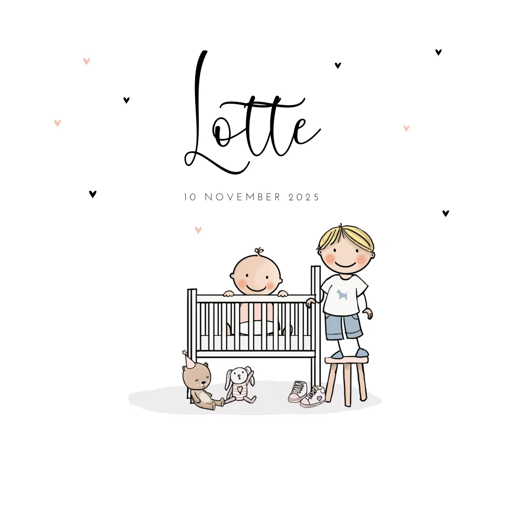 Schattig geboortekaartje voor je pasgeboren dochtertje met illustratie van grote broer die op een krukje staat naast een ledikant waar zijn baby zusje in zit. De hartjes maken dit kaartje echt lief!