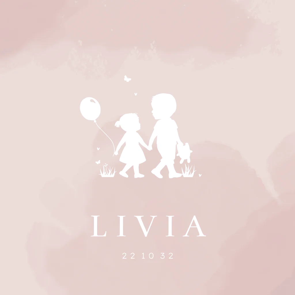 Een schattig geboortekaartje voor jullie tweede kindje. Het kaartje heeft een roze watercolour achtergrond. Op de voorgrond zie je jouw twee kindjes hand in hand lopen. De grote broer voorop en jullie kleine meisje achteraan met een ballon. De silhouetjes zijn gedrukt in roségoudfolie.
