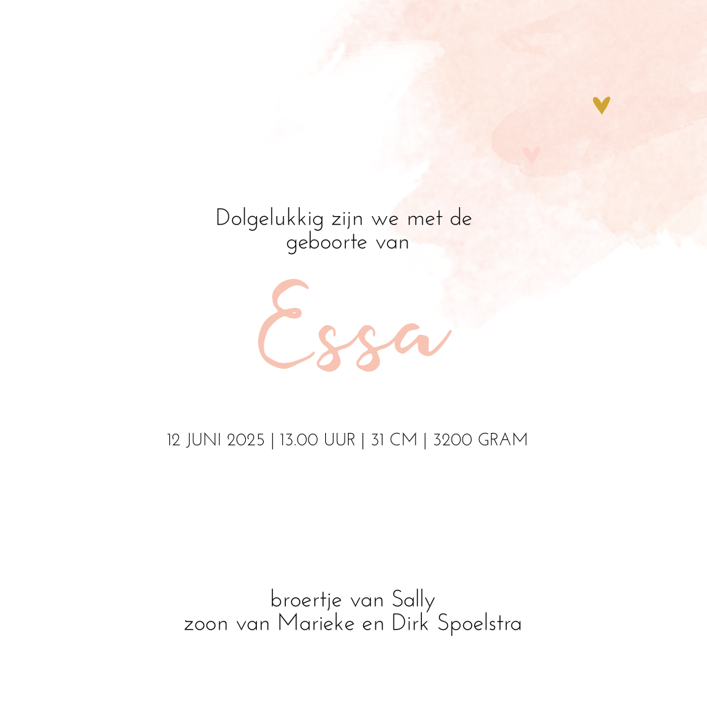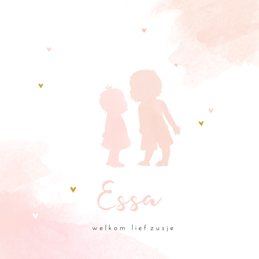 Schattige geboortekaart voor de geboorte van je tweede kindje. Op de voorkant staat een lief silhouet van een baby zusje die een kusje krijgt van haar grote broer. De zacht roze watercolor en hartjes maken dit kaartje helemaal af!