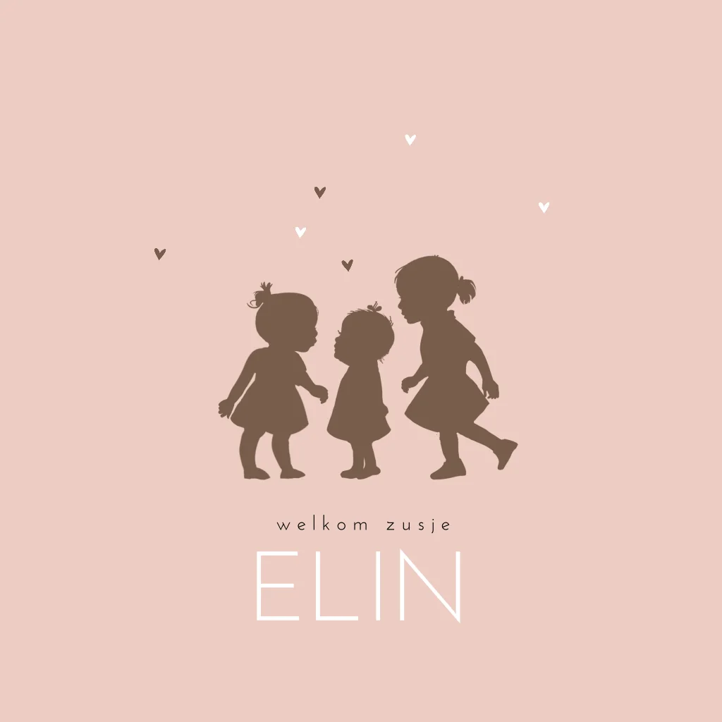 Lieve geboortekaart met roze silhouet van drie zusjes en hartjes