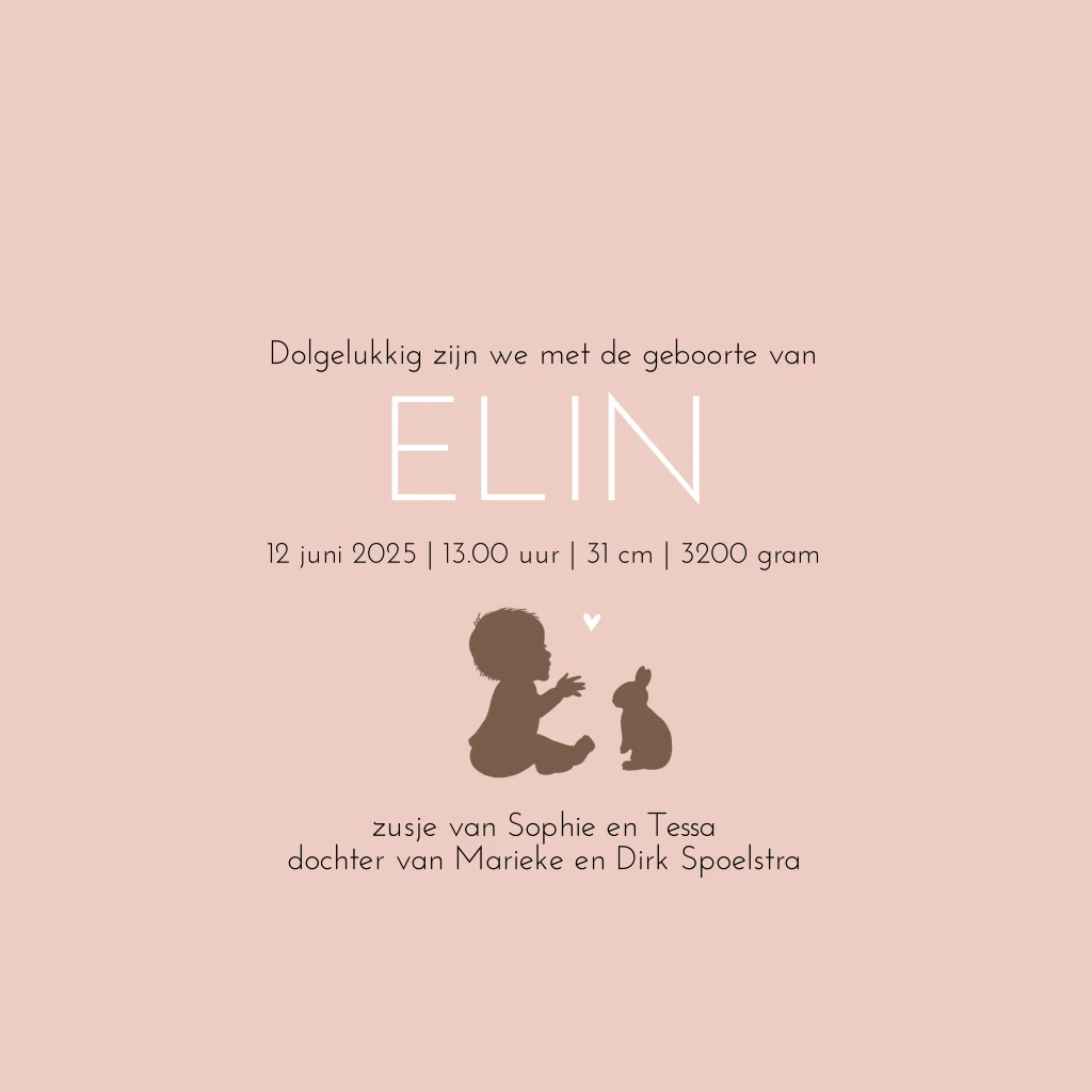 Gefeliciteerd met de geboorte van je derde dochter! Met dit lief geboortekaartje staan ze alledrie als silhouet op de voorkant. Het jongste baby zusje staat in het midden en krijgt van haar twee oudere zussen een kusje.