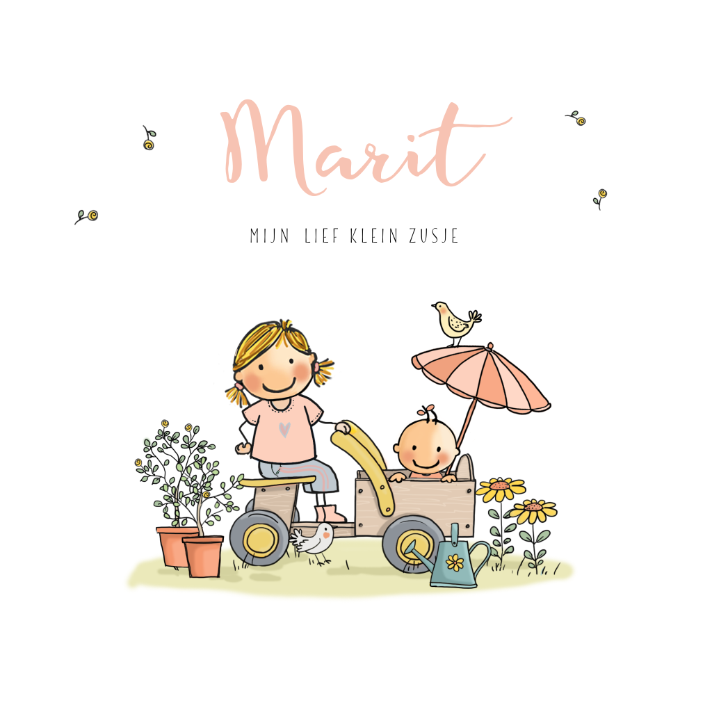 Gefeliciteerd met de geboorte van je tweede dochter! Stuur dit vrolijk geboortekaartje naar je geliefden en kondig haar geboorte aan! Super leuk kaartje met tekening van grote zus en klein baby zusje die samen in een houten kar tussen de bloemetjes zitten.