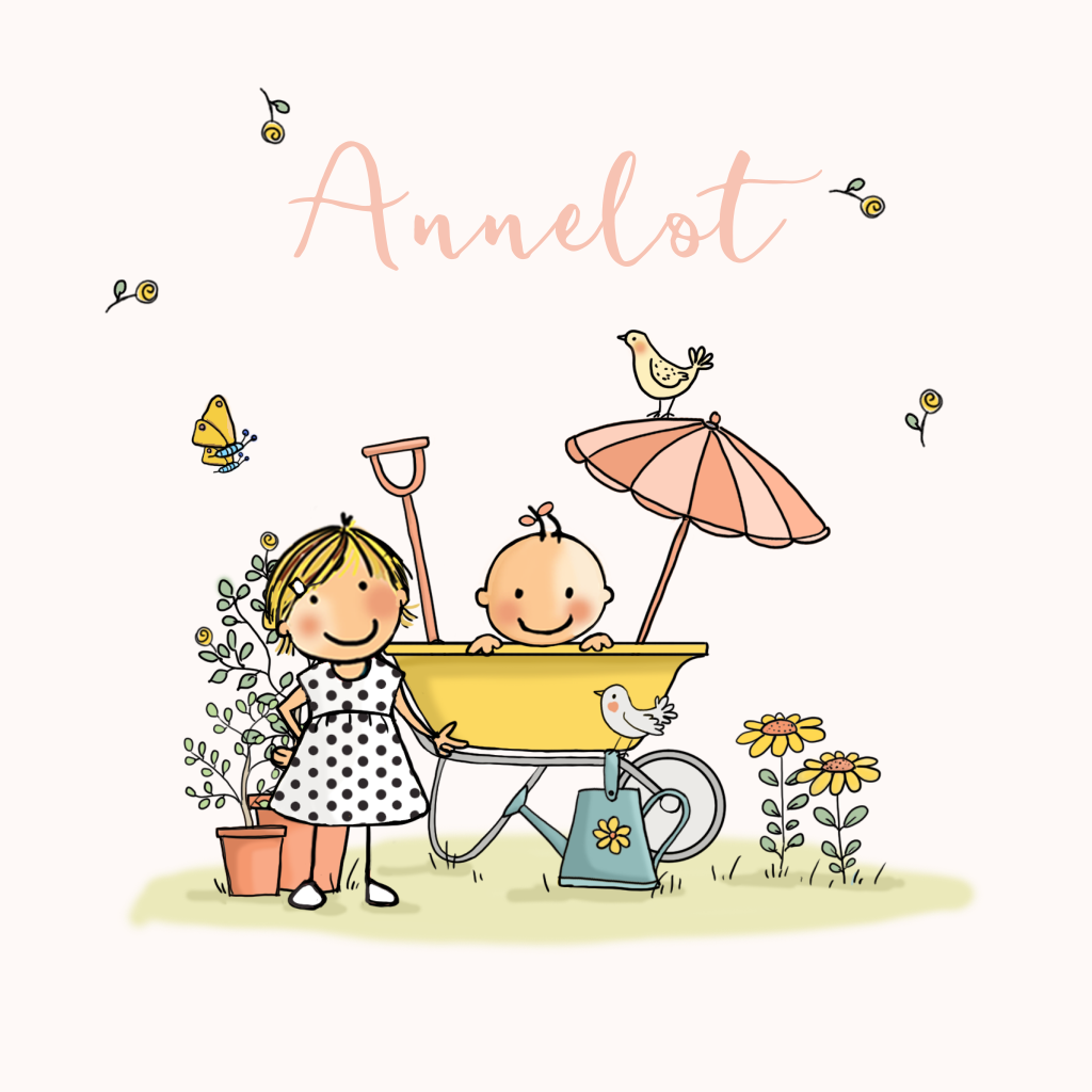 Super lief kaartje voor de geboorte van je dochter met vrolijke en zomerse illustratie van grote zus met haar kleine zusje in de kruiwagen met parasol buiten in de tuin. Met tekeningetjes van bloemen, vlinders en vogels.