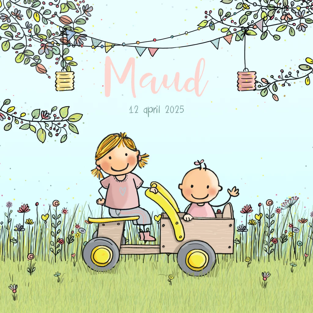 Super vrolijk geboortekaartje voor een lief meisje met illustratie van klein zusje die samen met haar grote zus in een houten fiets kar zit. De slingers, lampionnen en bloemetjes maken geven dit kaartje een lente/zomer sfeer.