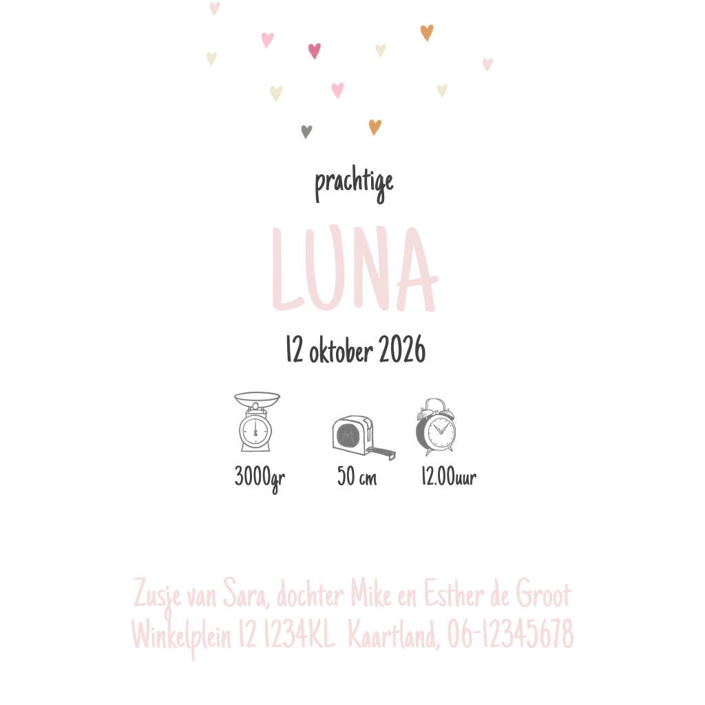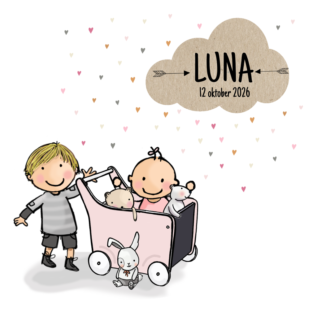 Lief, getekend geboortekaartje met een broertje en een zusje in loopkar en stoer kraft wolkje op gekleurde hartjes achtergrond.