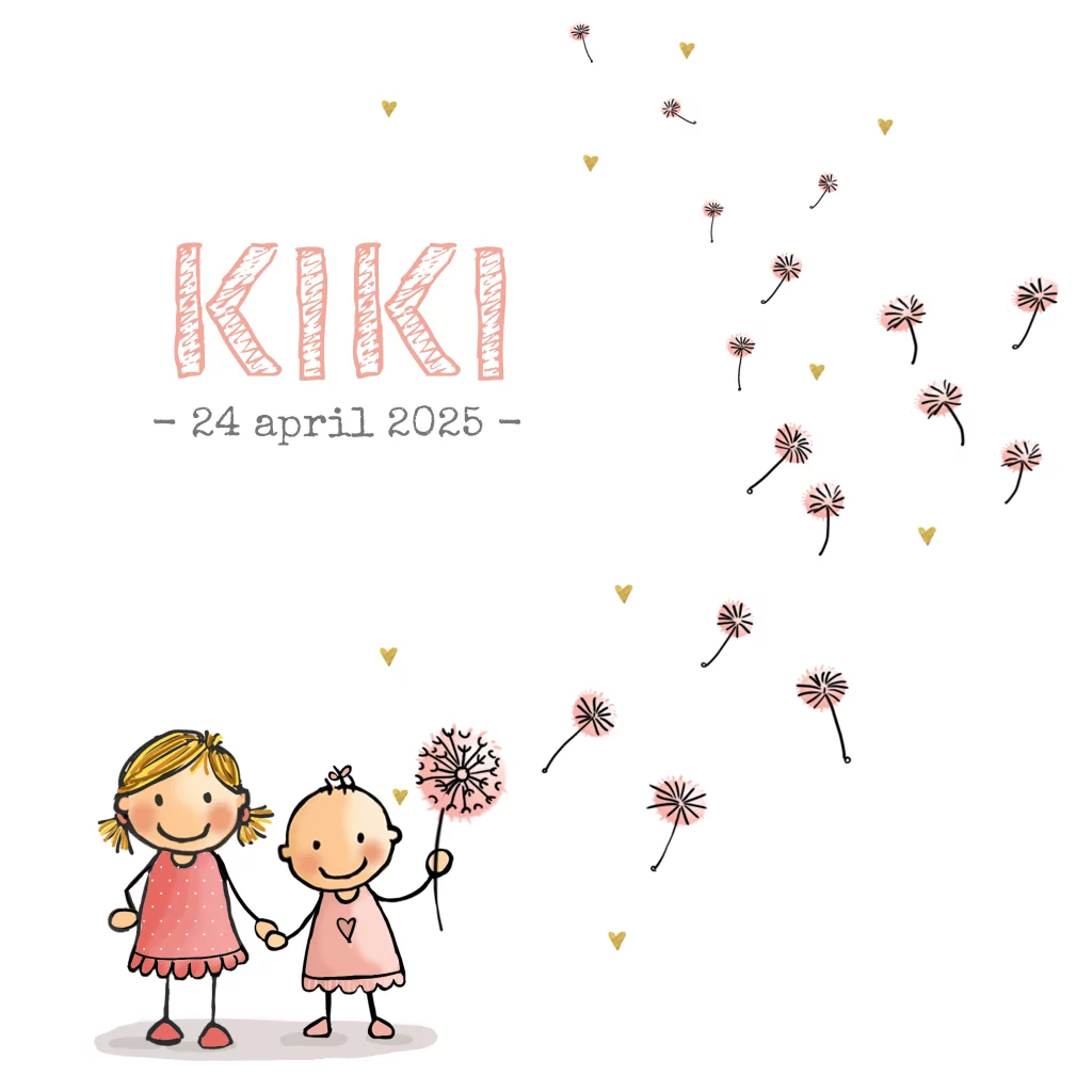 Mooi, hip geboortekaartje van meisje met zusje en een paardenbloem. Ook beschikbaar als broertje variant.