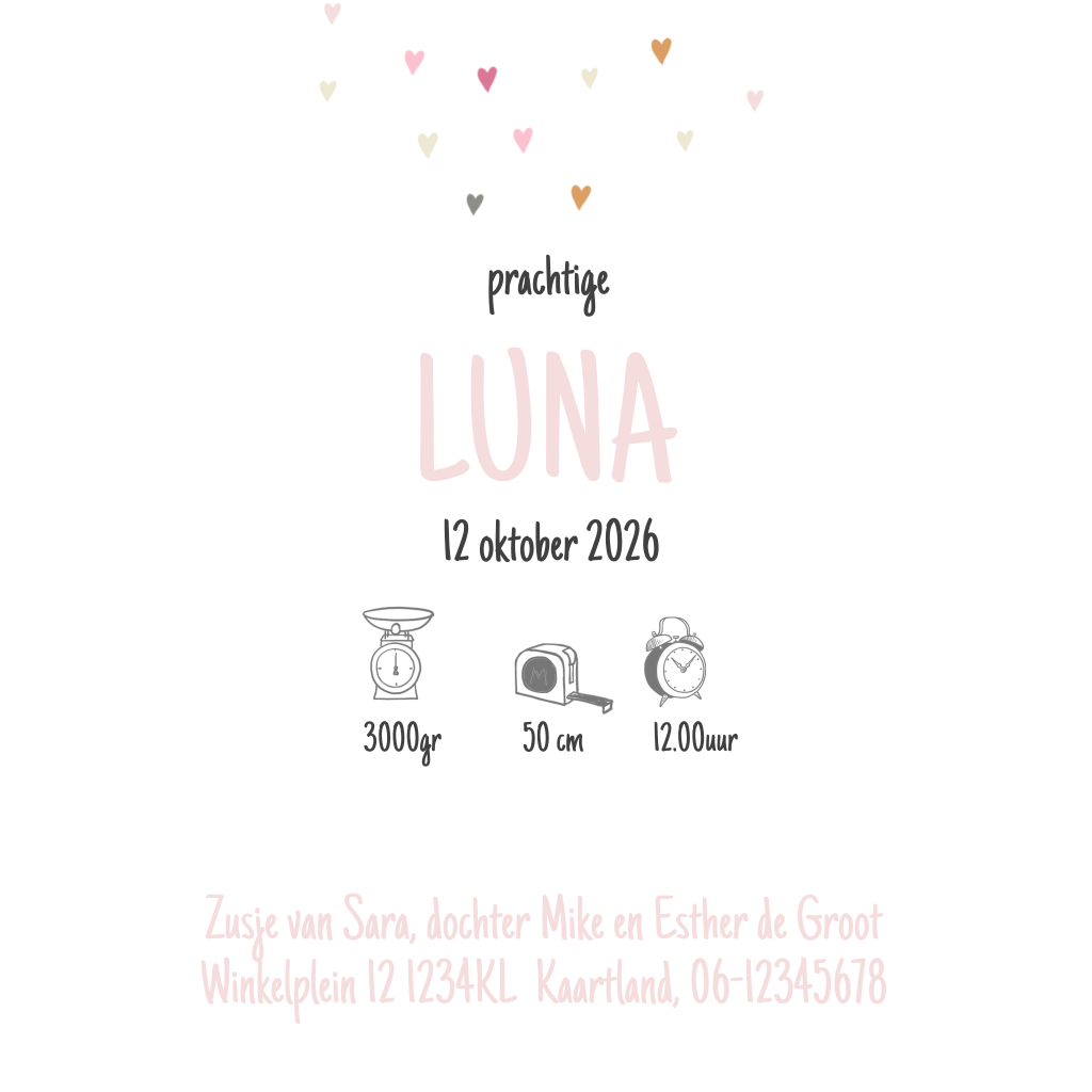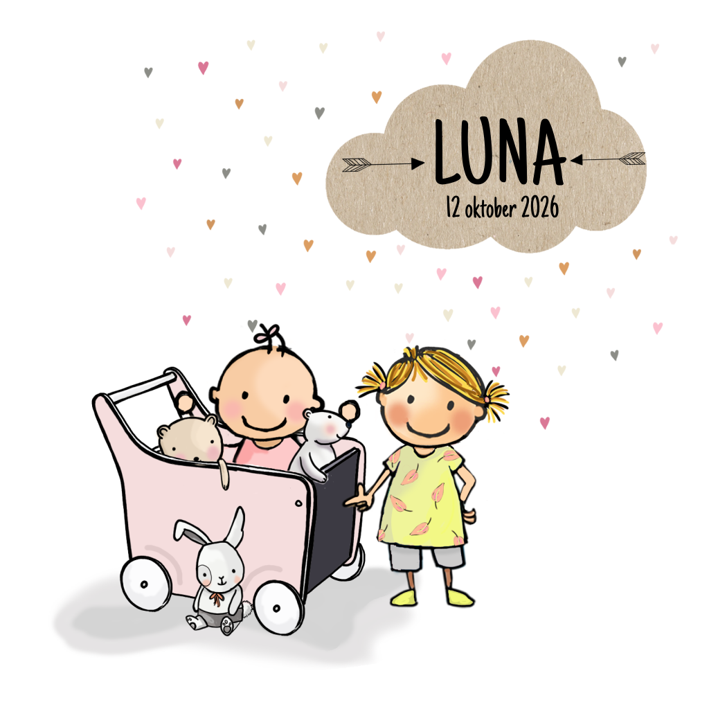 Lief, getekend geboortekaartje voor een zusje met kinderwagen en stoer kraft wolkje op een hartjes achtergrond.