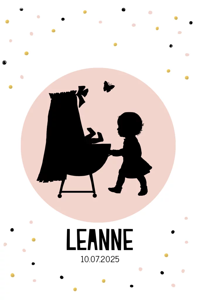 Lief geboortekaartje voor nieuw zusje met silhouet van wieg met grote zus in ronde cirkel van zalmroze met hippe stippen.