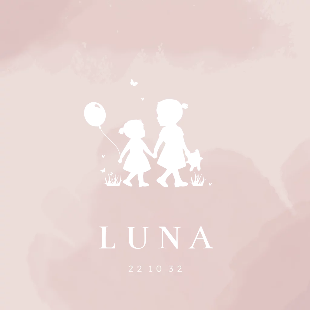 Een schattig en trendy geboortekaartje voor jouw tweede meisje. Op het kaartje zie je grote zus lopend met haar kleine zusje. De silhouetjes en naam zijn gedrukt in goudfolie. De achtergrond heeft prachtige roze structuur.