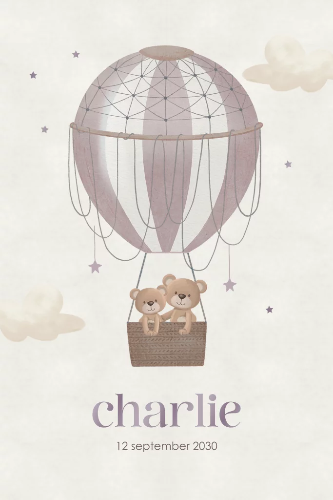 Het kaartje heeft beige tinten. In het midden zie je een luchtballon vliegen tussen de wolkjes. Het kaartje heeft details in hoogglans. In de luchtballon zitten twee beertjes. Pas het ontwerp naar wens aan in onze online editor.