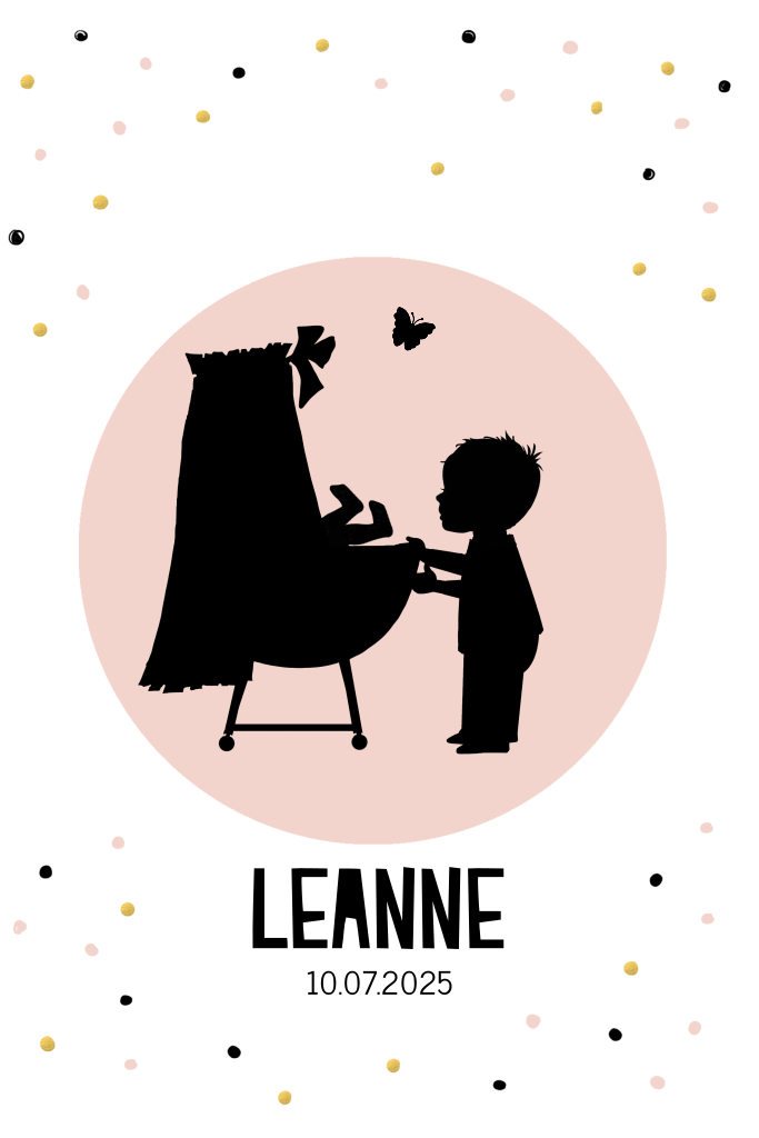 Hip geboortekaartje dochter met silhouet van wiegje en broertje in zalmroze ronde cirkel met hippe stipjes.