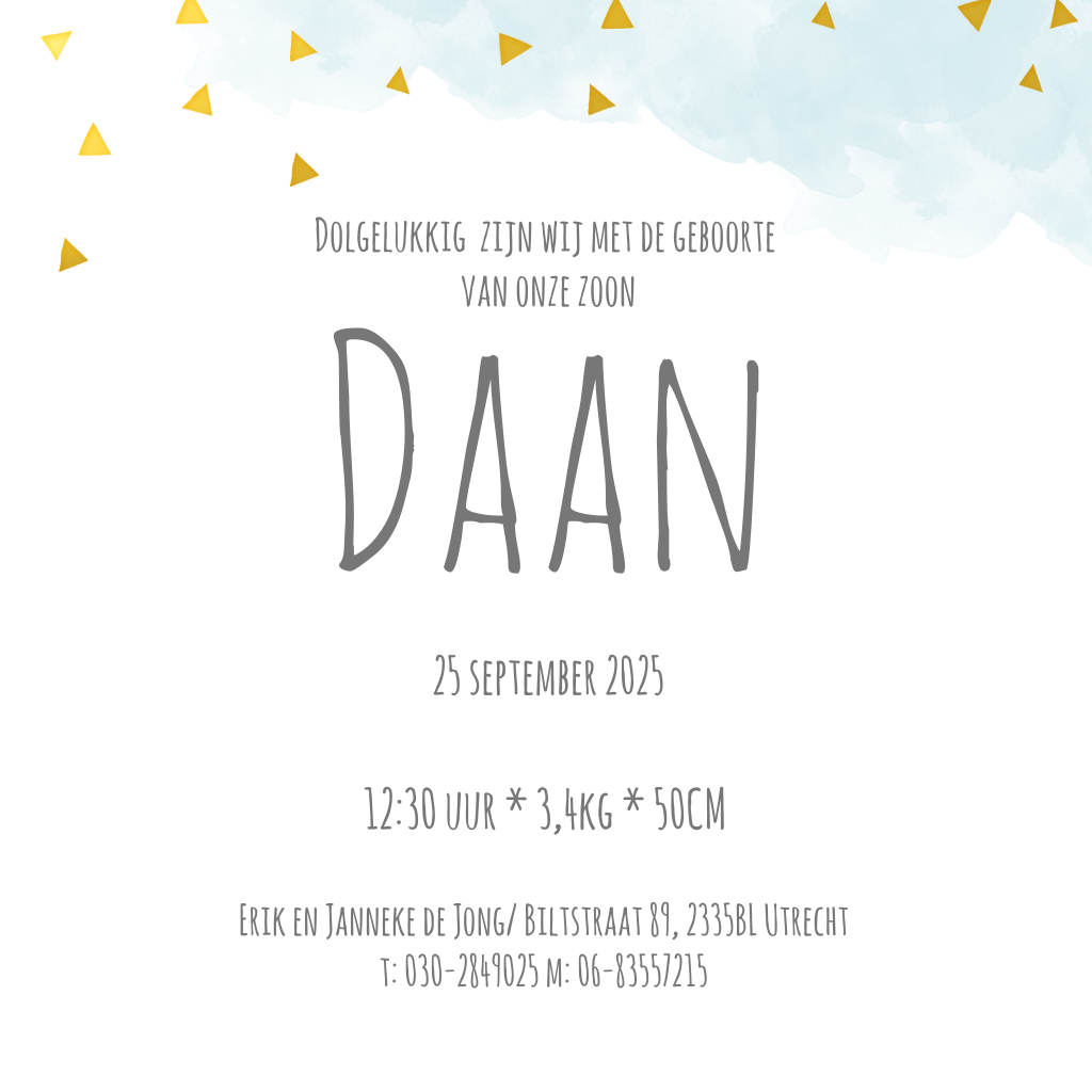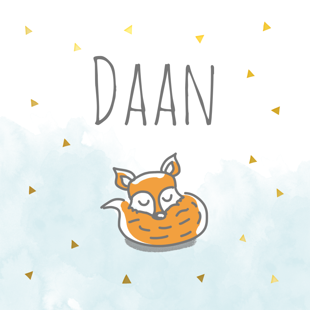 Super lief, een slapend vosje op dit geboortekaartje! De blauwe watercolourachtergrond in combinatie met driehoekjes in goudlook maken dit een superhip kaartje. Leuk voor een jongen!
