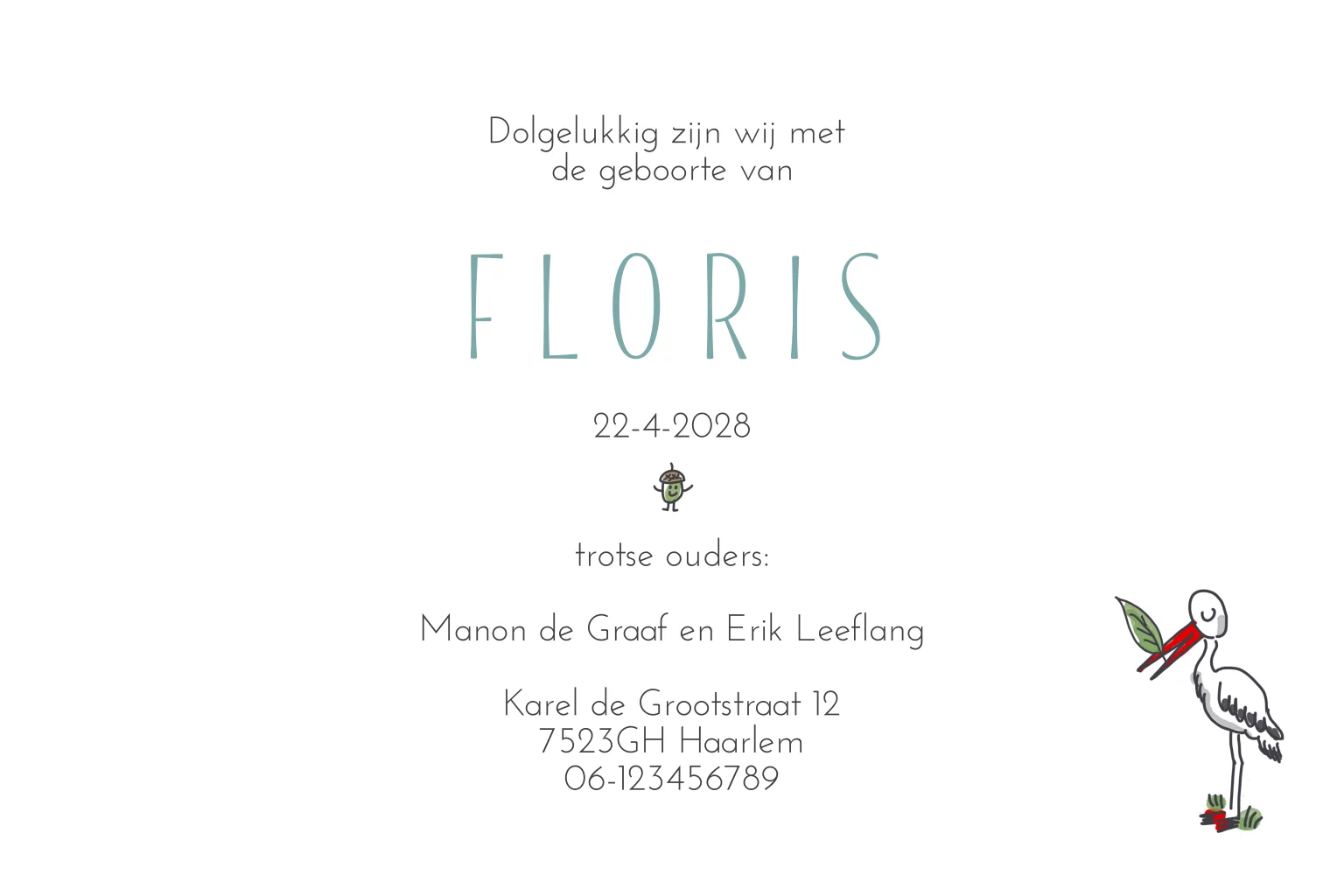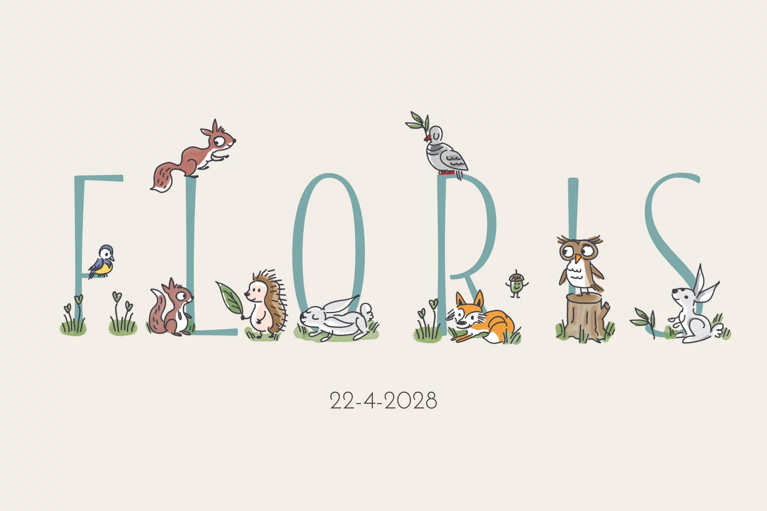 Een geboortekaartje met schattige dieren rondom de naam van jouw baby! Een eekhoorn, egel, uil, konijn, vos, duif en een koolmees. Pas het ontwerp naar wens aan in onze online editor.