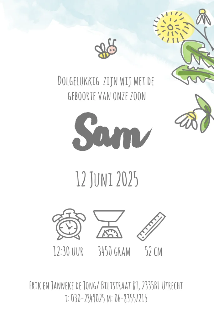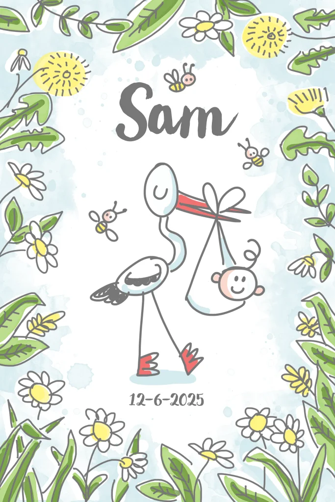 Dit kleurrijk geboortekaartje is leuk voor een jongen! Hij is gepimpt met afbeeldingen van onder andere een ooievaar met een baby. De blauwe watercolour-achtergrond en de rand van bloemen maken dit kaartje helemaal af!