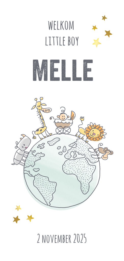 Schattig geboortekaartje voor jongen met baby en dieren op wereldbol